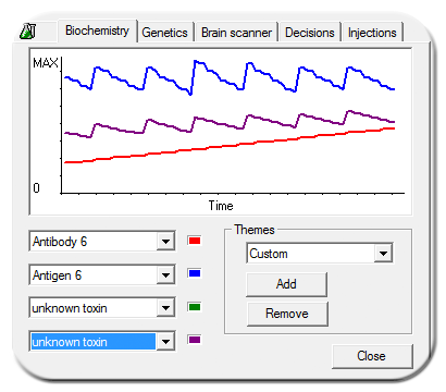 What a mess of an illness! Notice how two unknown toxins are included, but only one appears on the graph. This is because the two shared the exact same path, and gave Dalselv a double dose of unknown toxins. No sleep toxin was present, though, nor were any histamines. I expected her to suffer dearly, but her life force never fell below 76% while she recovered. Antibody 6 climbed quite quickly, unlike some of the other antibodies, which can take a very long time to rise. In no time, Dalselv was back to her healthy self! Aside from the extra sleep, there was no indication that she had even been ill. Take that, bacteria! I only hoped that the next illness would not be as complicated. That seemed a fleeting hope in the world of antigen vs. Norn, though. The fight would wage on!