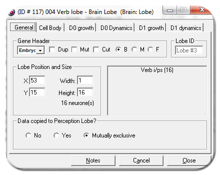 The main difference here is that the verb lobe is located at different coordinates in the brain. In examining the coordinates of the other lobes, we can see that the decision lobe is located under these new coordinates. Effectively, the verb and decision lobes overlap one another. I am not entirely positive how lobe locations affect the brain, but the description at Geatville seems to imply that this will aid in the Norn’s obedience. My assumption is that a spoken verb (i.e. push) will be copied to the decision lobe so that Dee will have to obey. Even though the width and height of the neurons is different, the original genome defines the width as 2 and the height as 8. Both of these calculations arrive at 16 neurons. This mutation is identical to the setup in the decision lobe.