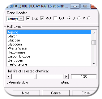 When the half-lives gene is opened up with the Genetics Kit, every individual chemical has a value associated with it. The slider at the bottom helps to distinguish how values range from extremely slow (left-side) to instantly (right-side). However, this does not state the length of time associated with each half-life. Those familiar with the Genetics Kit may know that choosing a new value will bring up information at the bottom of the main Genetics Kit window. This can still be time-consuming, as one must constantly change the value in order to reach the desired time. For this reason, a handy chart is presented below to compare the half-life values and times between C1/C2 and C3/DS. These values are the only valid options in the C1 and C2 Genetics Kits. Other values are possible via mutations, but opening a genomes in the Genetics Kit will round a mutated value to the nearest valid value.