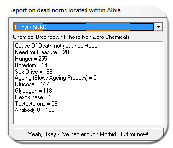 As an example, the report pictured here is part of the Norn Autopsy System. Disregard the fact that Ellidyr was a Grendel… This only proves that this feature works for all species! It provides a chemical breakdown, though I suspect that it may leave out certain unimportant chemicals. Although the cause of death is listed as unknown, I have used this report in the past for very accurate insights. We can see that Ellidyr was extremely hungry at his death, though he did not starve to death: He had a fair amount of glycogen in his system, along with some glucose. It also looks like he might have recently fought off an attack of antigen 0, judging by his elevated concentration of antibody 0. It was age that caught up with him, shown by his low level of the aging chemical. Not surprising, yet it’s interesting to see!