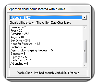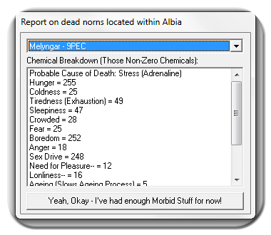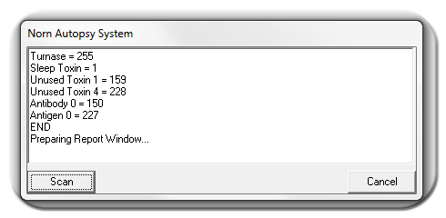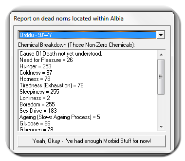 One important note about the Norn Autopsy feature in the Creatures Editor 32 is that it is not limited to just Norns: It also scans Grendels! The only other cause of death I have seen with the program is one that mentions either glycotoxin poisoning or starvation. This occurred when a Grendel had a feast of deathcap mushrooms, which led to his glycogen level and life force reaching zero. The probable cause of death provided by the Norn Autopsy is not always accurate, but I’ve always found the chemical breakdown to be most useful! I recommend using the Norn Autopsy as close to the time of death as possible. From my few experiences, it looks like chemicals continue to decay in a deceased Creature. Hopefully this provides some insight! Enjoy playing the Creatures coroner!
