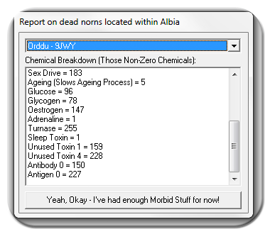 The second example from the Norn Autopsy comes from Orddu. She passed away at 11 hours and 43 minutes, yet she was also suffering from a fairly nasty illness at her death. The program offers no insight as to the cause of her death, which gives us an opportunity to solve the mystery! Her drives are fairly normal, considering the circumstances. She stopped eating during her illness, and also had sleep toxin in her system to keep her sleepy all the time. Orddu was also fairly bored, yet between sleeping all the time and staying still to conserve her energy, it all made sense. Her aging chemical is the giveaway here, indicating that she died of old age. It’s still worth a look to see the rest of her chemicals, just to be sure of our assessment! It never hurts to take a look at everything before coming to a conclusion.