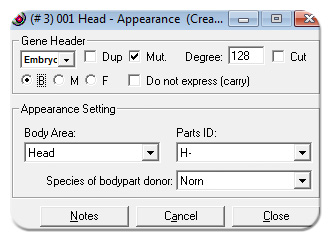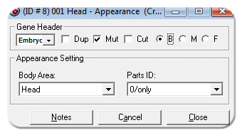 Finally, the head appearance gene in Creatures 3/Docking Station looks almost identical to the screenshot of the Creatures 2 Genetics Kit. The rather interesting change is the fact that it is set to be able to be duplicated and cut. Strange that this only occurs in the later game! Allowing an appearance gene to mutate on its own can be seen as a positive or a negative. On the one hand, a unique appearance can randomly enter a population. However, this is often undesirable, particularly if the appearance is from an breed the player does not like. We recommend unchecking the Dup, Mut, and Cut boxes for new breeds, unless there is a special requirement.